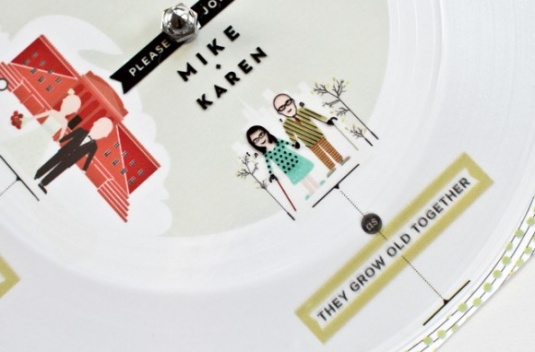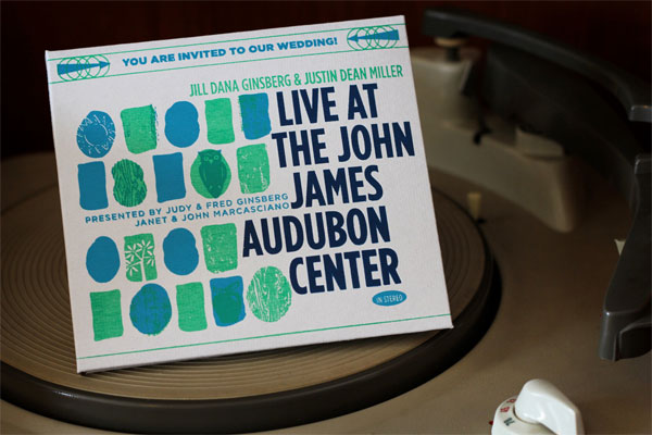 These custom screen printed invites may look like a vinyl album, but the clever design is actually a personalized mix CD with a hand screen printed case and coordinating wedding details pieces. If you’re a couple of music lovers, then these may very well be the invites that you’ve been looking for!
